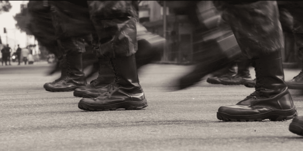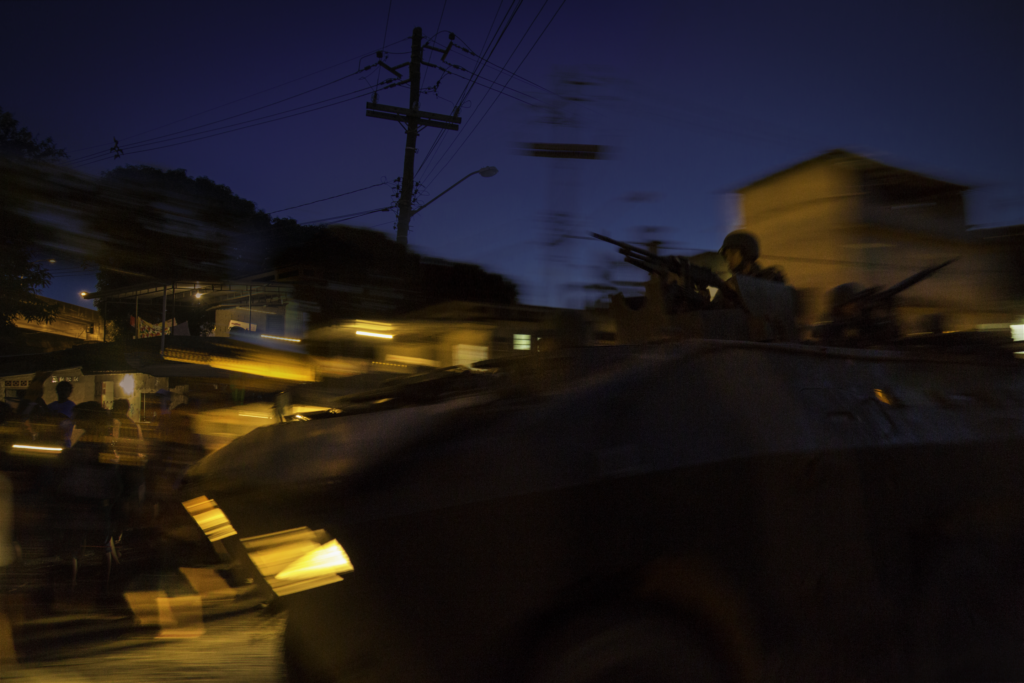 Esta humanidade não é limitada às vítimas, apesar de poder ser. Mesmo os agressores (ou “agressores”, para não colocar todos no mesmo saco) são tratados com a humanidade que negam aos moradores das favelas/comunidades. O plano detalhe dos coturnos ou da aliança na mão do soldado e o close nos rostos pintados revelam a ainda juventude ou inexperiência de homens e mulheres convocados a patrulhar áreas urbanas como se estivessem em uma zona de guerra. Para estes soldados, os moradores são inimigos e não pessoas, ou assim foram doutrinados a pensar pelo poder dominante. Mesmo assim, a dupla de diretoras jamais os desumaniza, embora não sejam ingênuas em desprezar o armamento que carregam consigo.