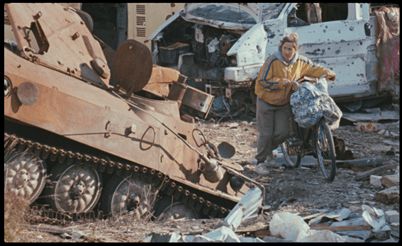 Essa inclinação se reforça nas escolhas de montagem que flertam com algo abstrato e experimental, em um esforço de capturar imagens e elaborar sequências menos convencionais, que tensionam o realismo típico do gênero e exploram o potencial da fotografia de 16mm. São nesses momentos que o filme documenta ainda melhor o conflito, porque explora a paisagem, sensibilidade e experiência humana, não o que já sabemos e conhecemos sobre o poder destrutivo de armas bélicas ou de cidades arrasadas. Aí, quando observamos as montanhas e paisagens naturais à distância e comparamos com os escombros da cidade de Mariinka, podemos observar a perenidade do natural em comparação com o humano. E a própria insignificância do indivíduo em um campo de guerra.