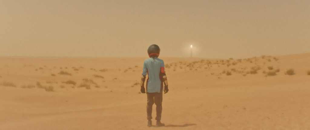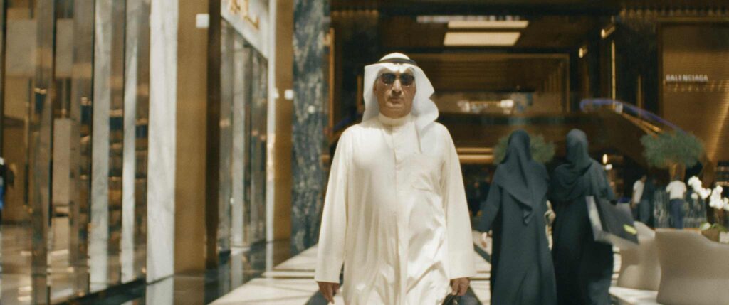 Even more eloquent is the figure of the delivery worker who keeps his face hidden beneath a helmet and mask. His lack of individual identity transforms him into a universal emblem of the gig economy. He is less a subject than the function he performs in urban daily life, a replaceable cog in an economy based on the exploitation of human beings and the environment they inhabit. The film intelligently suggests that this decrepit capitalist model – built on oil, rising carbon emissions, and global warming – is the same one that causes population displacement, deepens socioeconomic inequalities, and reorganizes the human body into a punishing and exhausting migratory regime. And what better place to stage this contradiction than the world’s largest oil-exporting hub, and one of the regions suffering most directly from extreme heat?