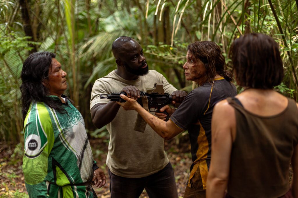 Mário é, simultaneamente, agente e testemunha. Ação e olhar. Diferentemente dos demais personagens, intrusos, de alguma forma, num espaço que não lhes pertence, ele é o único que não está de passagem – igual Patrícia ou Luiza -, o único cuja trajetória está associada à jornada espiritual até de restabelecimento de sua conexão com aquele território. É nesse ponto que Rio de Sangue revela uma ambição para além da ação: a tentativa de articular um cinema de gênero com uma reflexão e preocupação sobre a exploração e recolonização de terras indígenas em frente e também atrás das câmeras. Embora a presença de personagens indígenas e, mais importante, de consultores indígenas no processo de produção vá impedir que o filme se reduza a um olhar externo – colonialista portanto -, mesmo que não elimine completamente as tensões típicas dessa representação.