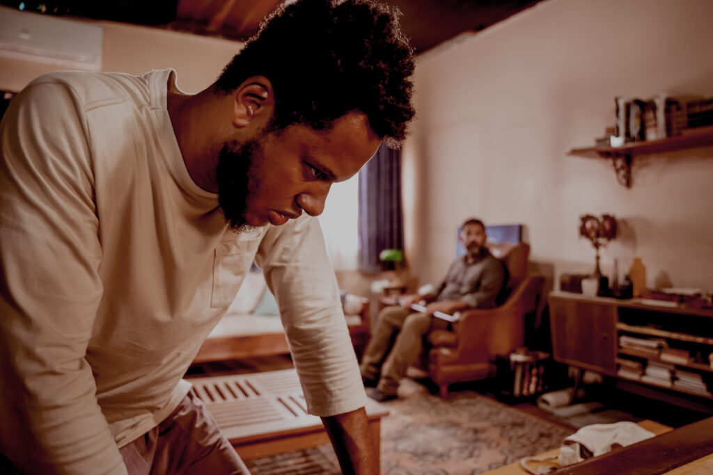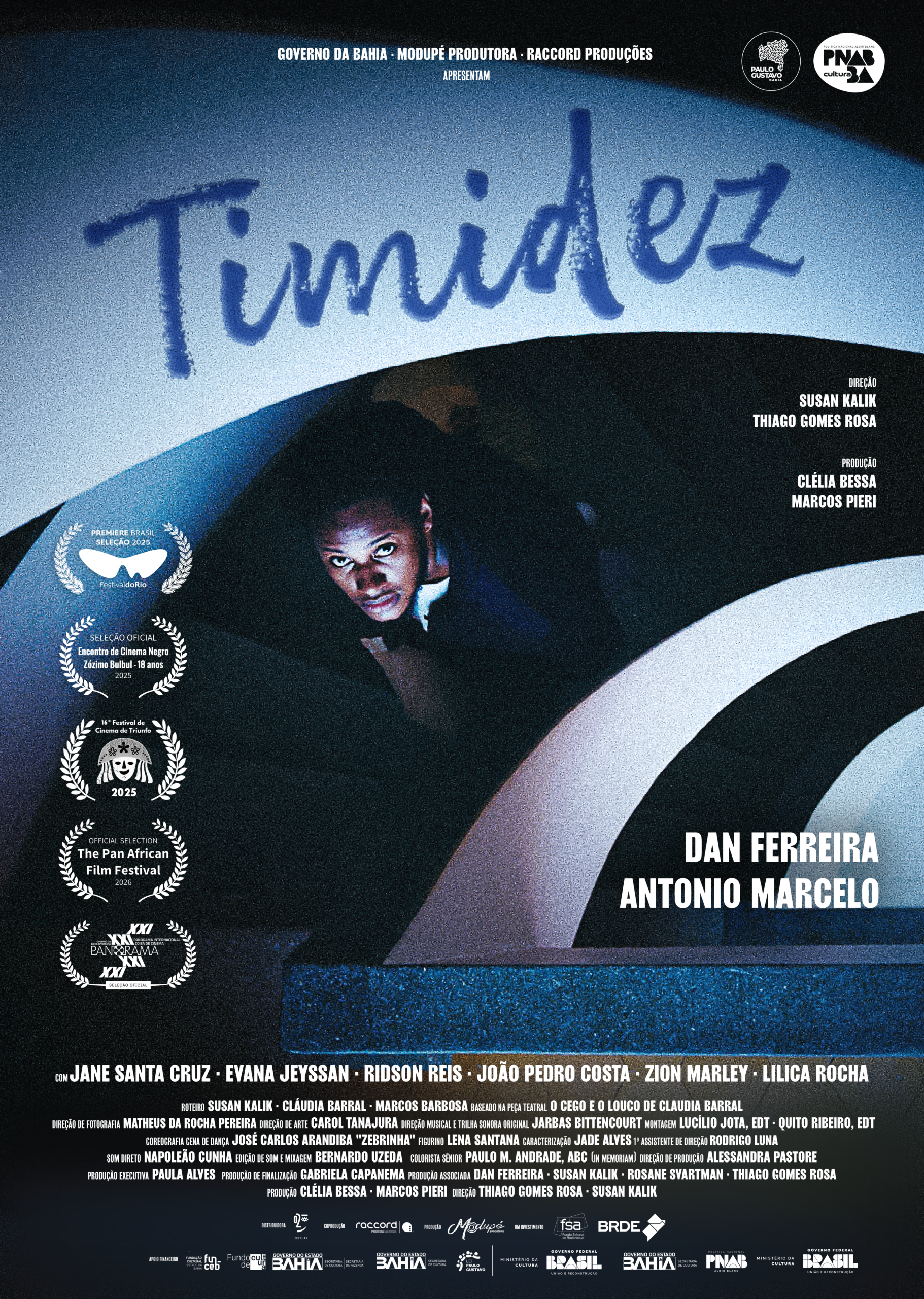 É nos reflexos invisibilizados dessa estrutura massacrante que Timidez, longa dirigido por Thiago Gomes Rosa e Susan Kalik, constrói uma narrativa claustrofóbica e sufocante, reveladora do estado mental de Jonas (Dan Ferreira), um jovem negro que sofre de ansiedade e inabilidade social não diagnosticadas, disfarçadas e reduzidas a mera timidez. Ele vive com o irmão cego, Nestor (Antônio Marcelo), em Salvador, num apartamento escuro, de cortinas sempre fechadas, paredes azuis e decorado com quadros abstratos e mobília desgastada pelo tempo. Entre os dois, a relação oscila entre afeto e cuidado, mas também controle e manipulação, uma dualidade encenada em um jogo espelhado de personalidades marcadas por traumas infantis e familiares ainda por elaborar, que comprometem profundamente uma vida adulta em constante busca por um respiro que nunca chega.